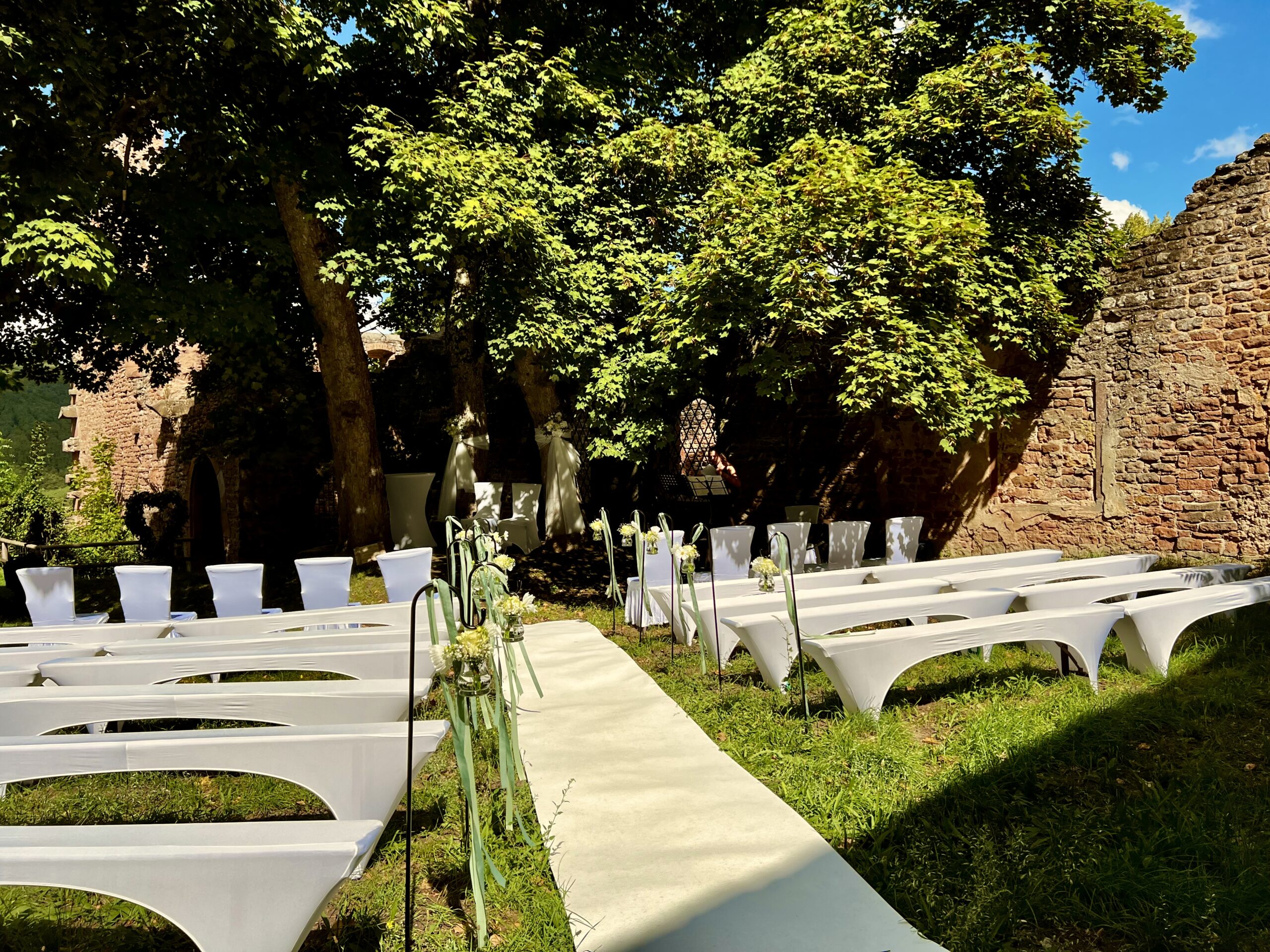 Bänke und/oder Stühle mit weißen Hussen in Reihen parallel zum Trautisch gestellt ergeben dabei ein besonders schönes Bild und